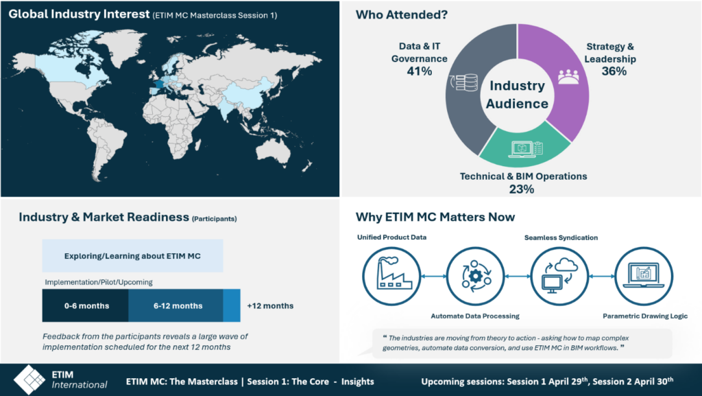 La otra iniciativa que se inauguró la semana pasada fue la ETIM Academy de ETIM International. Estrenamos el formato ETIM Academy webinar con una primera sesión introductoria del proyecto ETIM Modelling Class -ETIM MC-, a la que seguirán una serie de sesiones denominadas ETIM MC Masterclass, ya en preparación. Aquí se puede ver un extracto de la sesión: